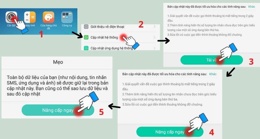 Đầu tiên hãy Khởi động lại điện thoại => truy cập vào Cài Đặt (Setting) => chọn vào mục Cập nhật (Update System) => nhấn vào Tải về (Download) => sau khi tải về bạn nhấp tiếp Nâng cấp ngay (Update now) => tiếp tục nhấn vào Nâng cấp ngay (Update now)